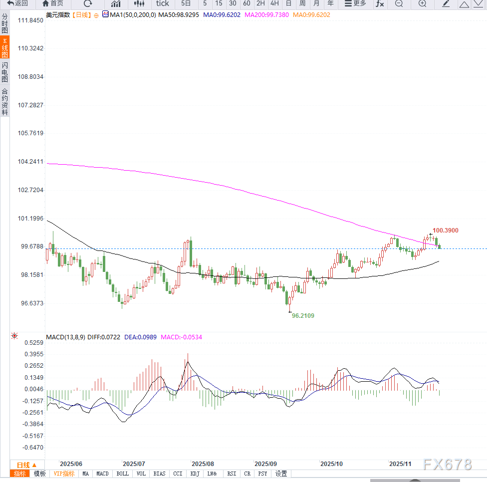 若短线反弹,则上方100.30—100.60将构成首要阻力。整体来看,技术面与基本面共振,短线仍偏向下行结构。