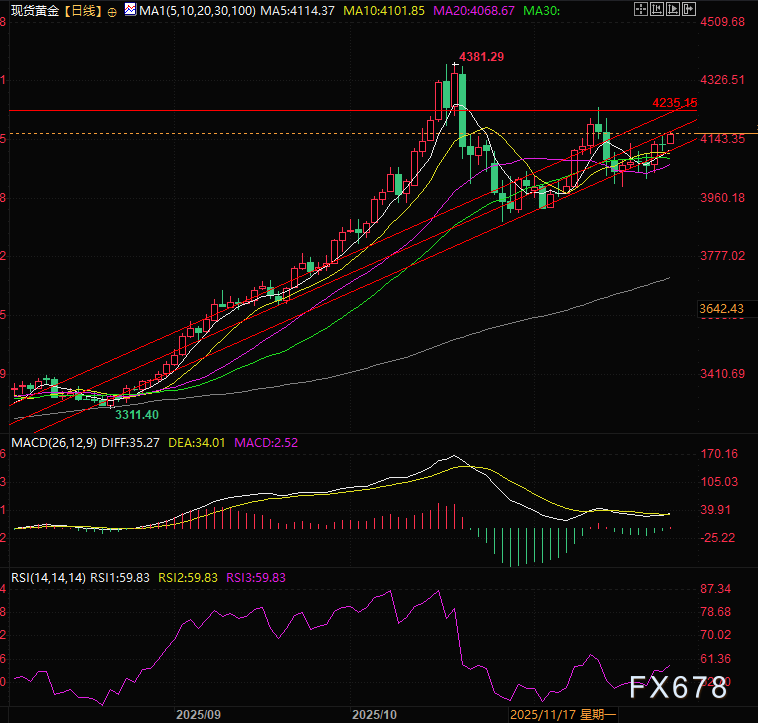 KCMTrade首席市场分析师蒂姆·沃特表示:“当前市场预期已明显偏向12月实施降息。美联储官员的集体鸽派表态,再加上温和向好的经济数据,从收益率维度为黄金价格提供了强劲支撑,进一步夯实了降息的逻辑基础。”
