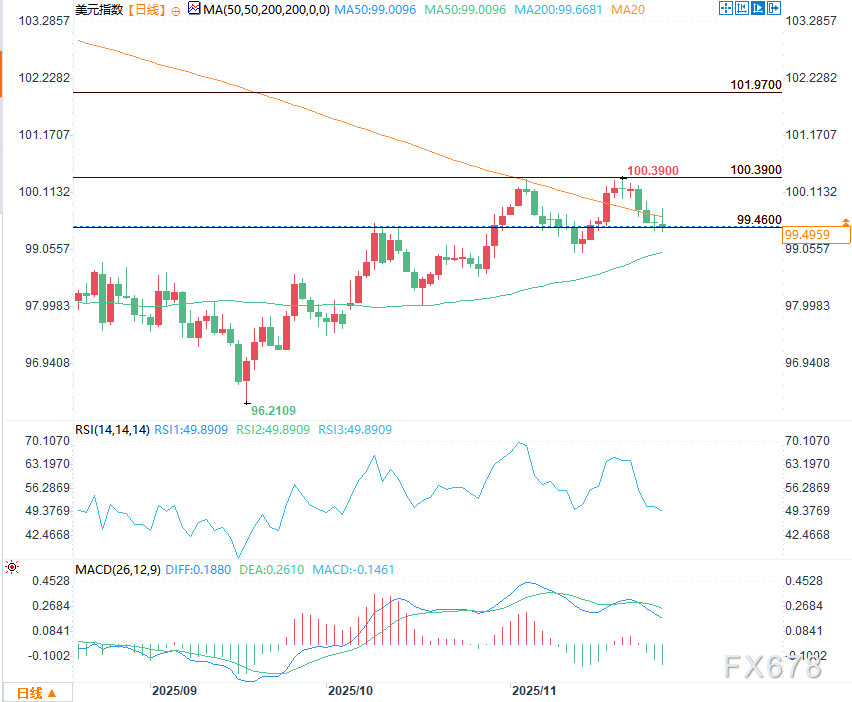 汇通财经APP讯——周五(11月28日)美盘交易时段,美元指数迎来小幅回升走势,但这一反弹力度有限,未能扭转其自七月下旬以来最陡峭的周度下跌态势。受此前感恩节假期影响,市场交投活跃度在假期后持续处于低位,即便全球交易员陆续重返市场,有限的资金流动仍使得价格波动幅度受到明显限制,整体市场呈现出谨慎整理的特征。
