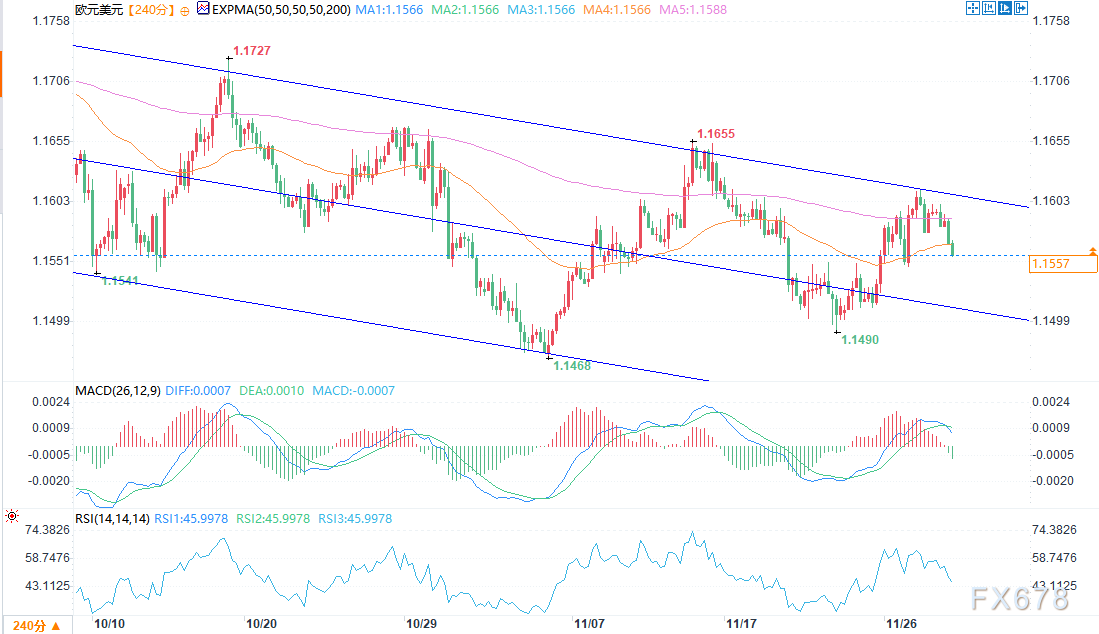即时支撑位见于前期阻力转换位1.1550(接近11月21日及24日高点)。进一步下方,1.1500心理关口与11月5日低点(约1.1470)将对空头构成考验,再往下则是当前约1.1420的通道下轨。