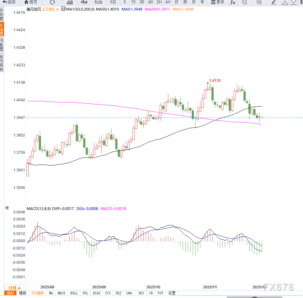 从日线图形来看,USD/CAD维持窄幅区间整理:当前价格徘徊在1.3920—1.3980之间,显示短线买卖力量均衡;