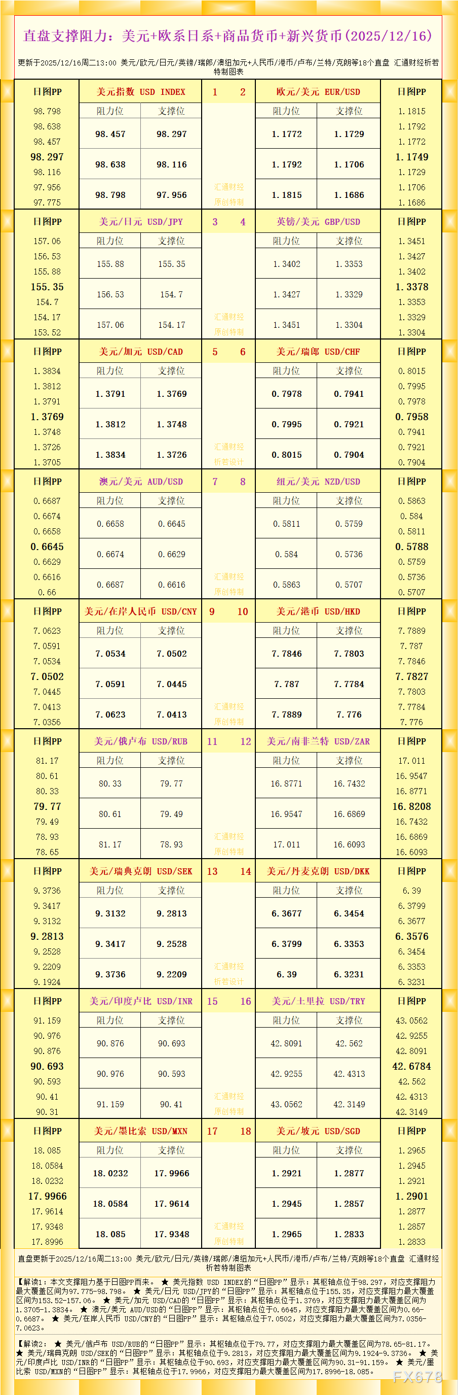 ex外汇开户:一张图看18个直盘外汇支撑阻力:美元+欧系日系+商品货币+新兴货币(2025年12月16日)
