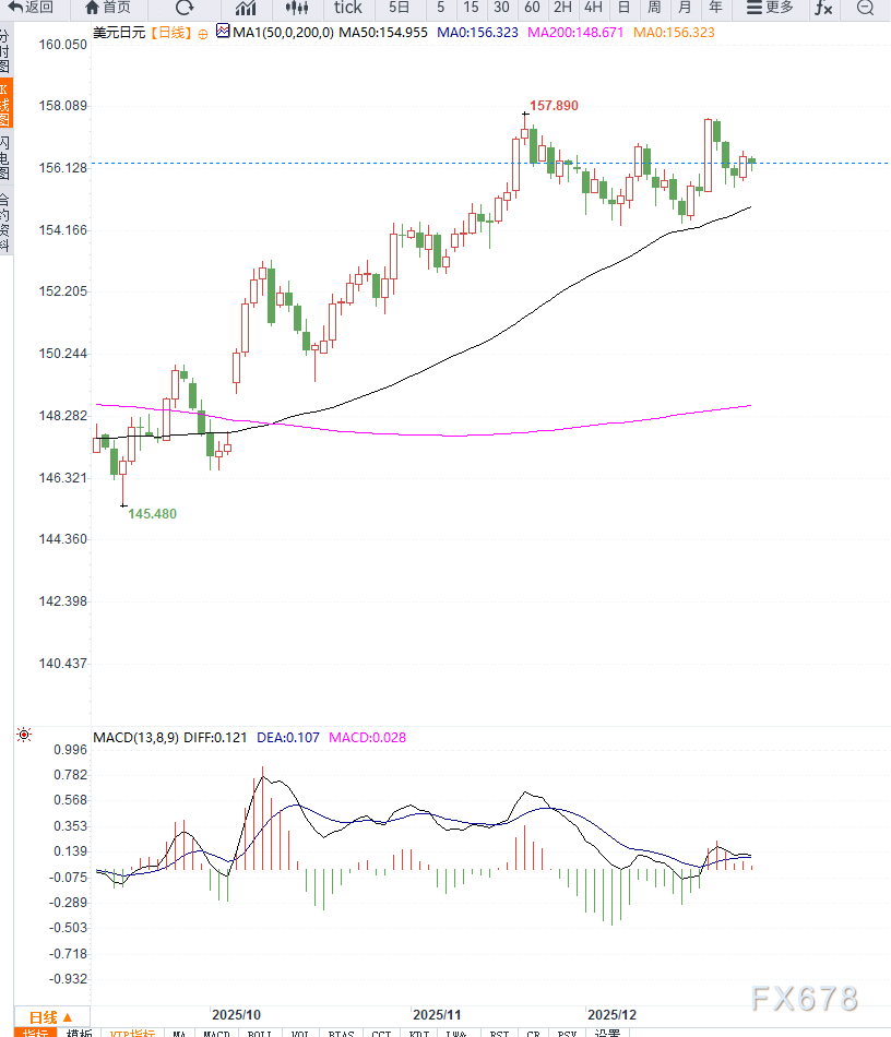 从日线结构来看,USD/JPY在前期快速拉升后进入高位整理阶段,近期在156—158区间反复震荡,动能明显减弱。K线形态显示,高位上影线增多,反映上方抛压增强;