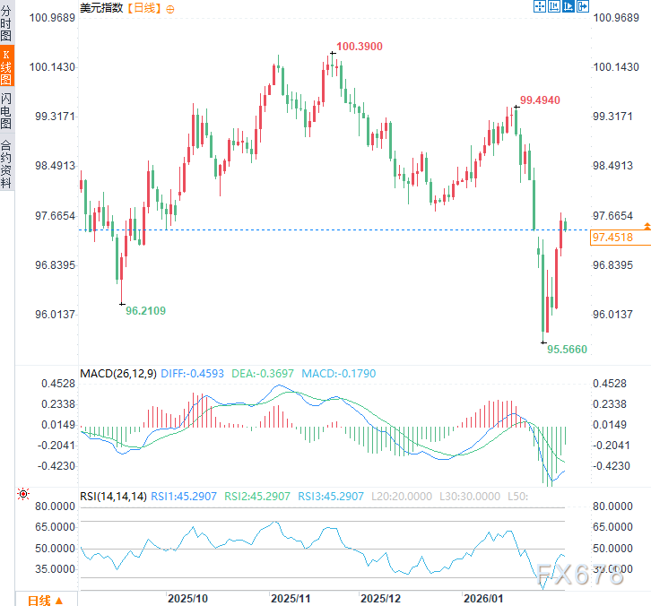 周二(2月3日)亚市时段,美元指数于97.45附近震荡。
